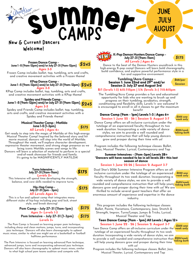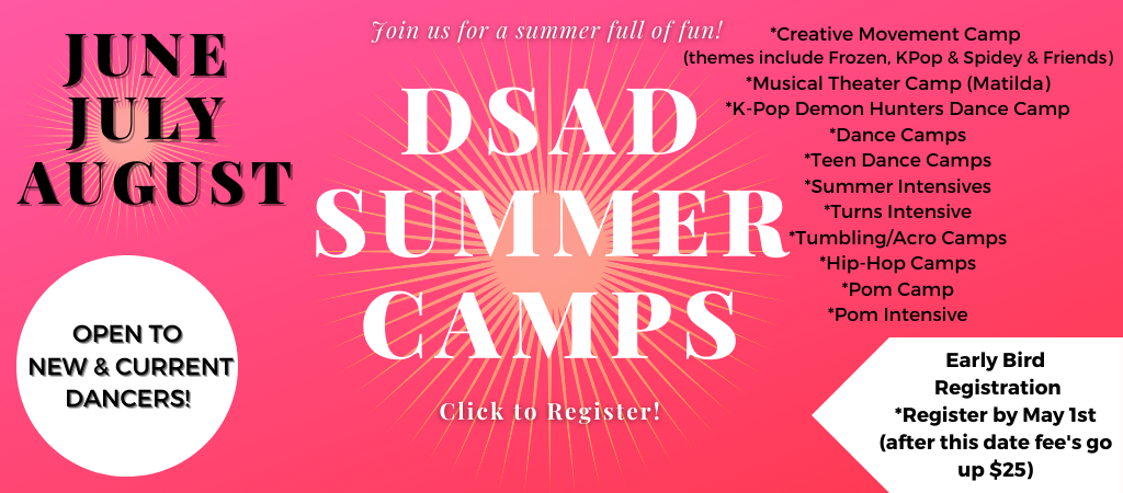 We offer a variety of summer camps for ages 3+ June – August! CLICK TO REGISTER FOR CAMPS TODAY! **MAKE SURE TO SCROLL DOWN TO “SUMMER 2026” IN THE DROP-DOWN ON THE REGISTRATION PAGE!